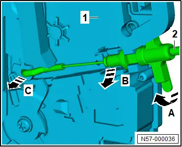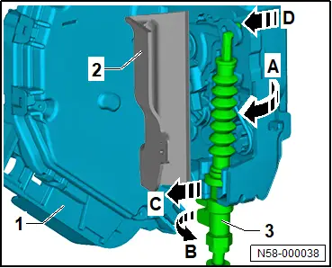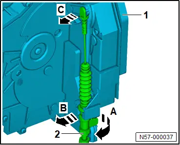 – Turn Bowden cable -3- 90° in direction of -arrow A-, and unclip it in direction of -arrow C-.