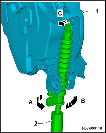 – Swing Bowden cable -2- until Bowden cable -2- can be guided out of eyelet in door lock -1- in direction of -arrow C-.