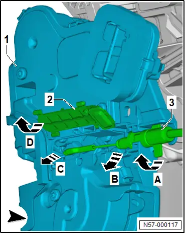 – Detach Bowden cable -3- in direction of -arrow D- from door lock -1-, and remove Bowden cable.
