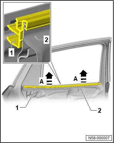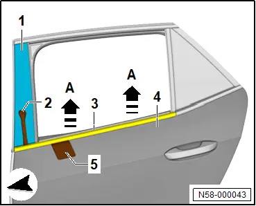 – Position window slot seal -1- in direction of -arrow A- centrally between front section of window guide -4- and rear section of fixed rear door window -3-.