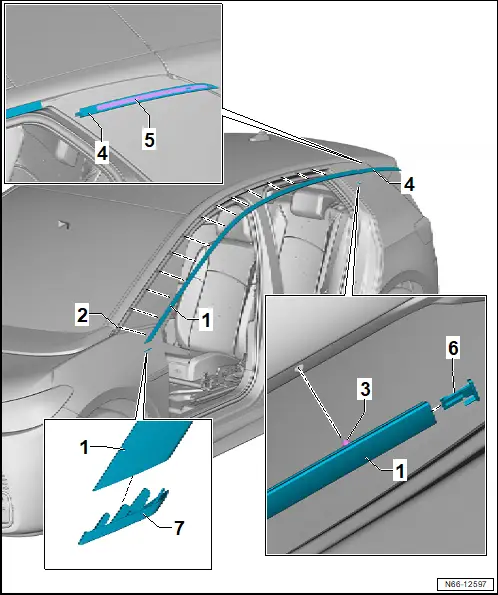 ❏ → Rep. gr.66; Removing and installing rear roof trim strip